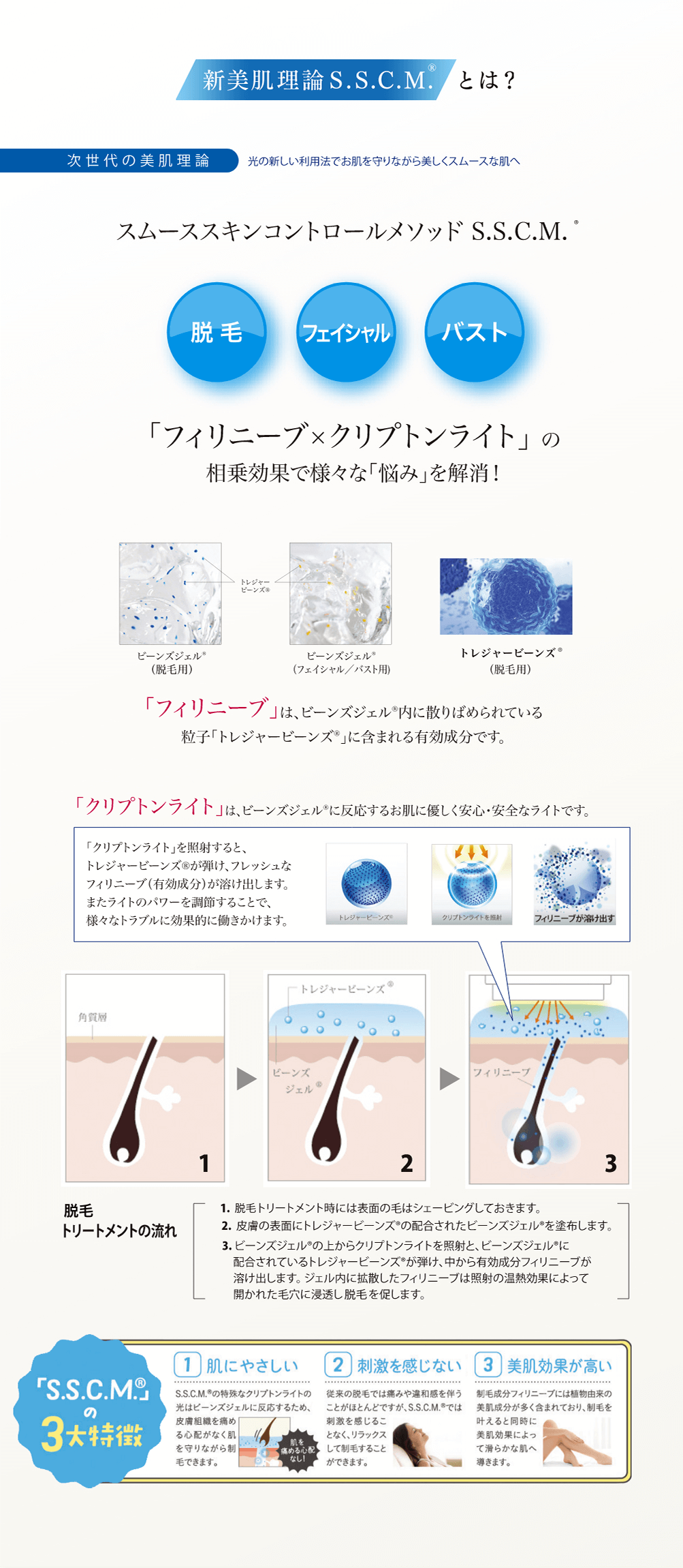 独自の制毛理論(SSCM・スムーススキンコントロールメゾッド) 安全、安心な純国産機器を用いて 本当に価値のある脱毛、最上の脱毛をあなたに…。